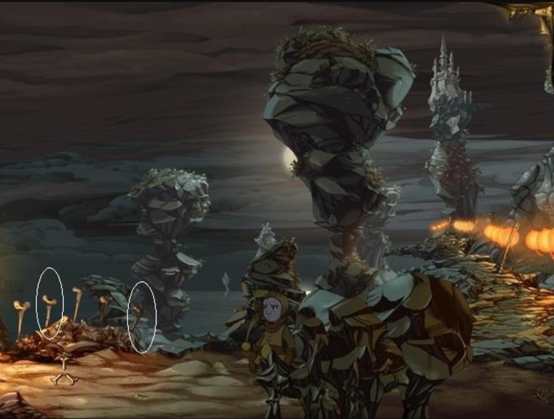 Spoglądamy na bramę, na której znajduje się rysunek czaszki. Podnosimy kamień leżący na ziemi. Wchodzimy na zapadnię, ale nic się nie dzieje. Przechodzimy w lewo. Widzimy skały, które przesuwają się wraz z naszym wędrowaniem. Zerkamy na kurki w kształcie kości. Wszystkie one ustawione są w prawą stronę.