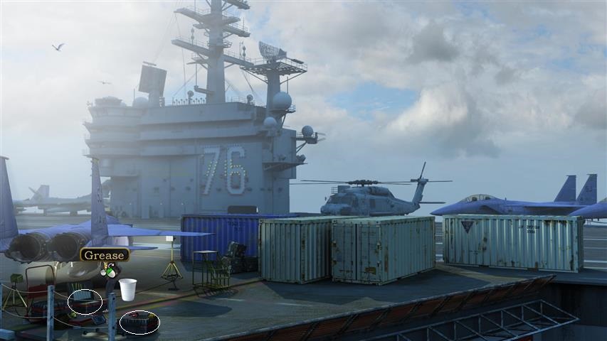Rozglądamy się po pomieszczeniu. Zaglądamy do kosza na śmieci, przy siedzącym na wózku asystencie. Nina znajdzie paski plakatu i ołówek. Otwieramy szufladę biurka, z której wyciągamy plastikowy model UFO. Zabieramy też niedopalone cygaro (na biurku przy fotelu) i wychodzimy na zewnątrz.