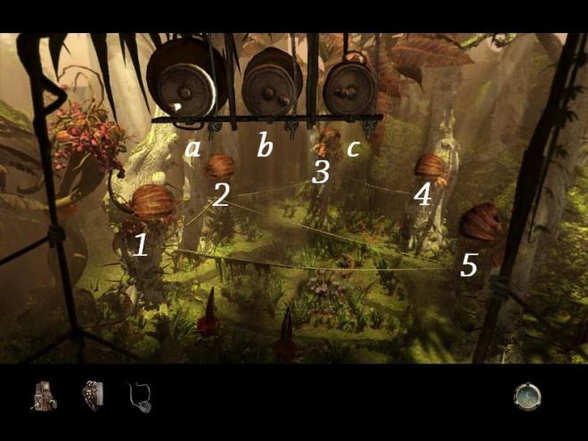 - kołowrotek c – dźwięk długi, kołowrotek a – dźwięk krótki, kołowrotek b – dźwięk krótki, zwierzak rzuci owocem w pierwszy domek, a potem w zwierza, który wpadnie do dziury i zostanie otruty proszkiem wydzielanym przez roślinę.